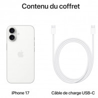 iPhone 17 - Ecran : 6,3" Super Retina XDR OLED , 120Hz - Résolution : 2622 x 1206 pixels à 460 ppp - Système d'exploitation : iOS 26 - Processeur : Apple A19 (3 nm) Hexa-core GPU 5 cœurs avec accélérateurs neuronaux - Mémoire RAM : 8 Go - Stockage : 256 Go - Appareil photo Arrière : Grand-angle Fusion 48 MP f/1.6, 26 mm & Ultra grand‑angle Fusion 48 MP f/2.2, 13 mm, et champ de vision de 120° & Zoom numérique jusqu’à 10x - Appareil Avant : Caméra Center Stage 18 MP, f/1.9 - Commande de l’appareil photo - Enregistrement vidéo Dolby Vision (4K, 1080p et 720p) - Connectivité: Wi‑Fi 7,5G, Bluetooth 6, NFC, USB Type-C - Lecture vidéo: Jusqu’à 30 heures - Streaming vidéo: Jusqu’à 27 heures - Batterie: Li-Ion 3692 mAh - Charge rapide jusqu’à 50 % de charge en 20 minutes - Sans fil MagSafe jusqu’à 25 W - Sans fil Qi2 jusqu’à 25 W - Fonctionnalités: Face ID, Apple Pay, Siri - Indice de protection IP68 - Détection des accidents - SOS d’urgence par satellite - Couleur : Blanc - Garantie : 2 ans