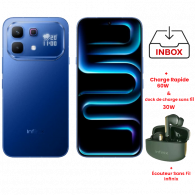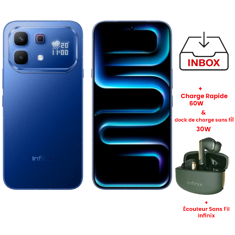 Infinix Note 60 Pro - Ecran : 6.78 pouces Amoled (1208 x 2644p), 144 Hz - Processeur : Qualcomm SM7635-AC Snapdragon 7s Gen 4 (4 nm) Octa-core - Système d’exploitation : XOS 16, Android 16 - Mémoire : 12Go extensible jusqu'à 24Go - Stockage: 256Go - Appareil photo arrière: Dual 50 MP + 8 MP - Avant : 13MP - Capacité de Batterie: 6000 mAh + 90W Charge rapide - Connectivité : Wifi, Bluetooth 5.3, 5G - Capteur: Empreintes digitales, Accéléromètre, Boussole, Gyroscope, Proximité - Deux haut-parleurs avec son par JBL - Système de refroidissement liquide VC - Double SIM - Protection IP64 - Couleur : Bleu - Garantie : 1 an